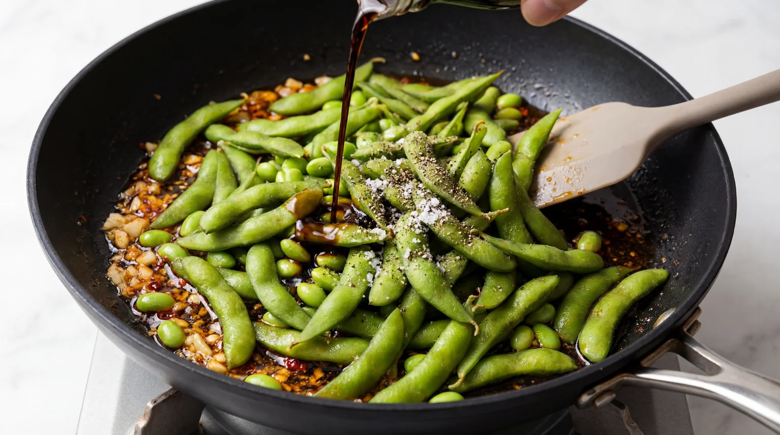 The secret lies in tossing the seasonings while the edamame is still hot and slightly damp, allowing the garlic and chili to bloom and adhere properly.
