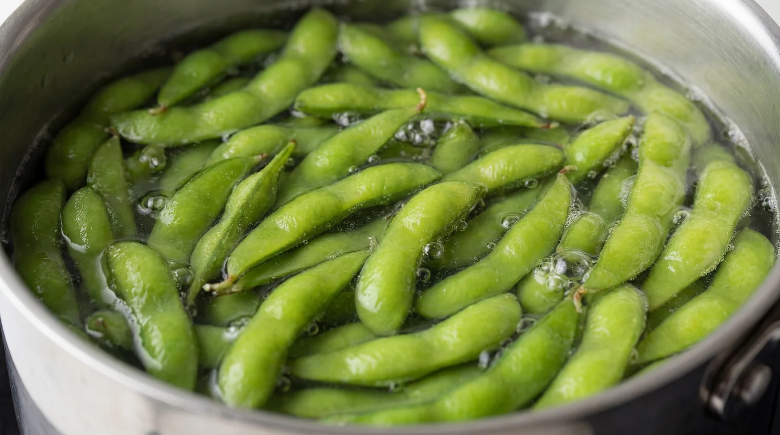 Bring a large pot of salted water to a rolling boil (use about 1 tablespoon salt per quart of water). Add frozen edamame directly from the freezer and cook for 5-6 minutes until bright green and tender. Don’t overcook - they should retain a slight firmness.